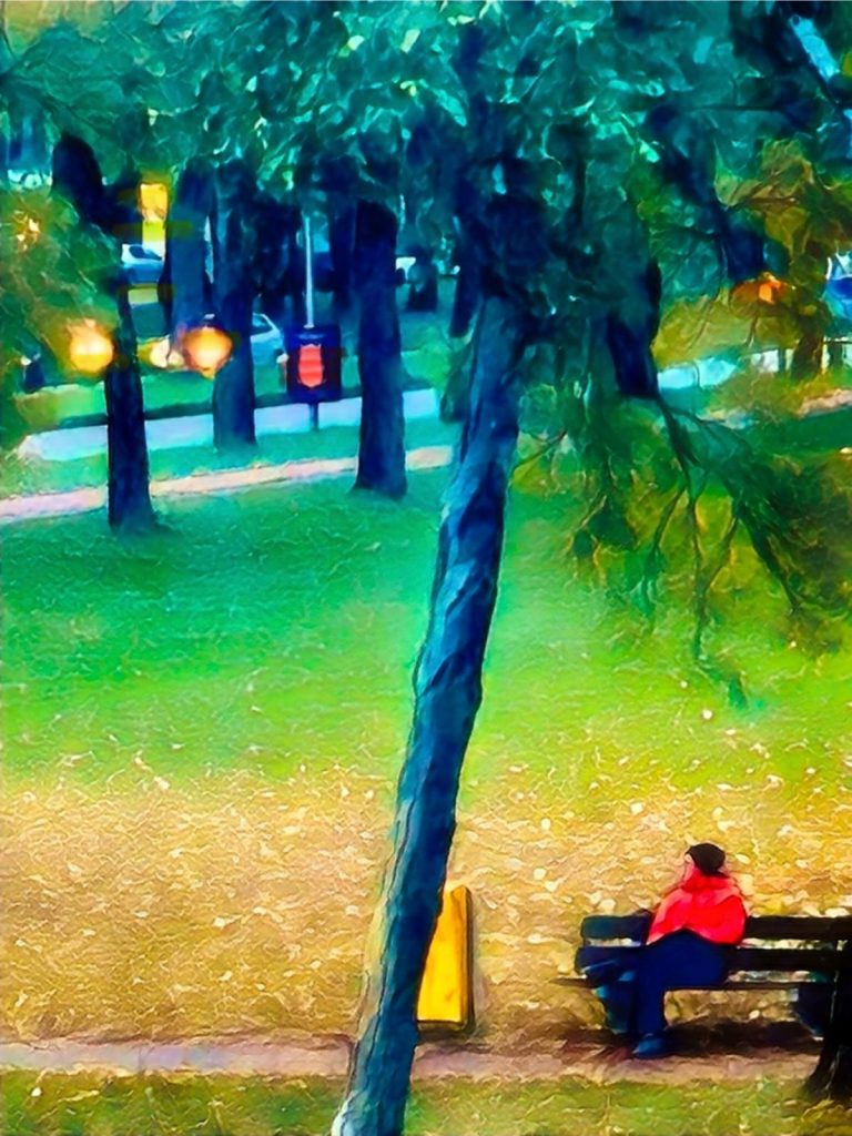 Owp een bankje bij de glasbakzit een man, een soort filosoofin een jas van dikke wolalsof hij wacht op sneeuw