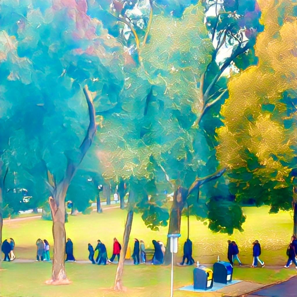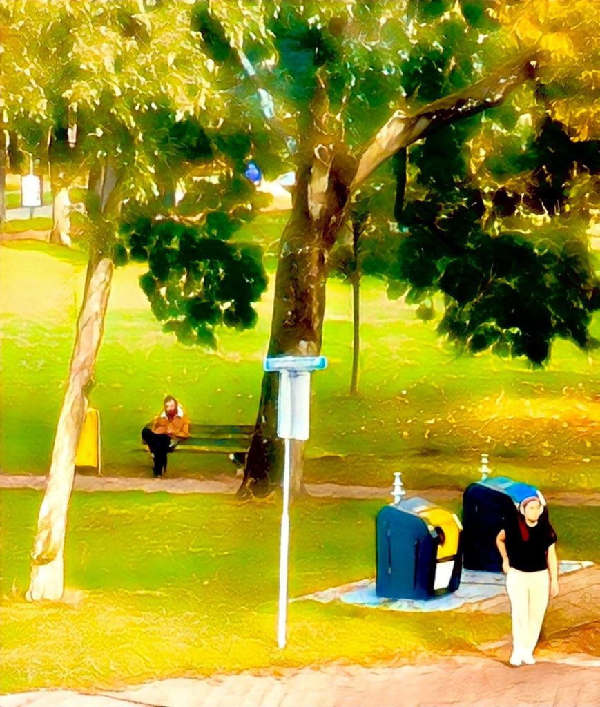 Rustmoment in de stad Op een bankje tussen bomen zit de stad even stilEen bezorger, oranje als de avondzonademt uit tussen