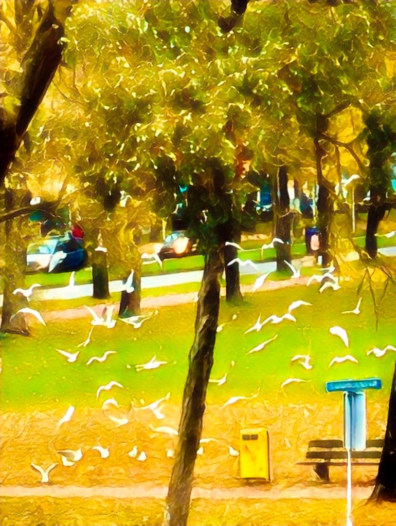 Een wolk van meeuwenbreekt open boven mij.Ze vallen, stijgen, vallen weerzoals gedachtenvan voorbijgangers Ik sta hier vastgeschroefdtussen herfst en verkeerverlangend