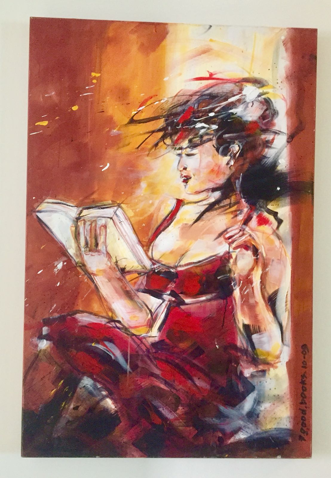 Ondanks het vele moois maak ik snel een keuze het wordt de lezende vrouw. Ik doe snel zaken en vijf minuten na binnenkomst ben ik een mooi schilderij rijker.